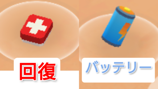 回復アイテムで体力が回復(初期500上限)したり、バッテリーで体力(+20)、攻撃力が上がるので、積極的に取りましょう!!