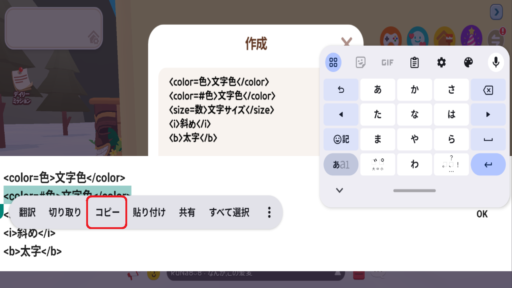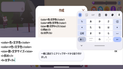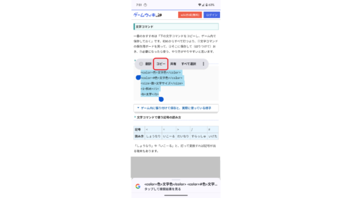 一番のおすすめは「下の文字コマンドをコピーし、ゲーム内で保存しておく」です。初めからすべて打つより、①文字コマンドの保存用ボードを買って、②そこに保存して(はりつけて)おき、③必要になったら使う、やり方がやりやすいと思います。