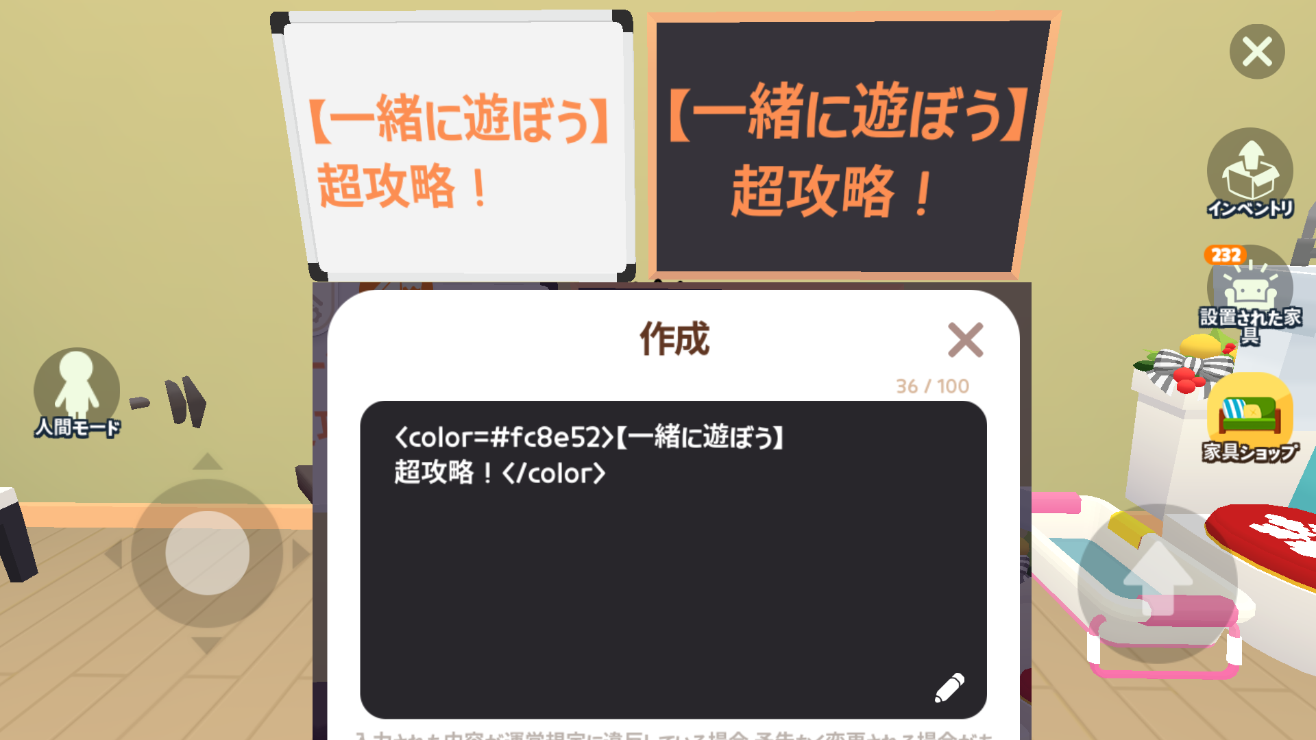の3つが使えます。値段が24宝石する「ホワイトボード」は飾りです。何も打てません。