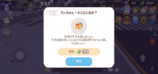 探している途中で建物に入ったり広場から移動すると、探し物の配置や子犬の出現エリアが変わってしまうので注意!