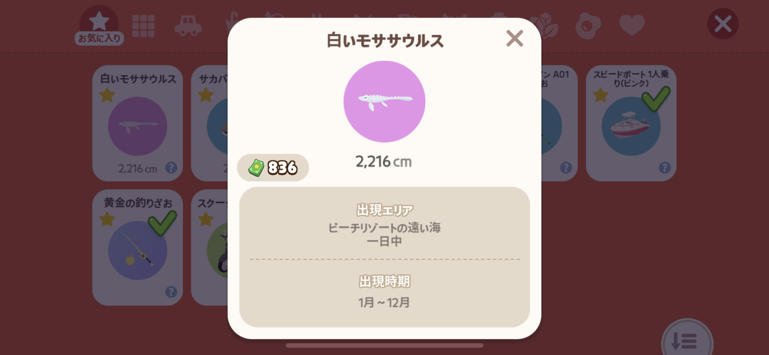 ![]() | マカジキ | 深い海/ボート/灯台/ビーチリゾート(沖)/ビーチリゾート(難破船)/ビーチリゾート(深海) | 一日中 | 特大 |