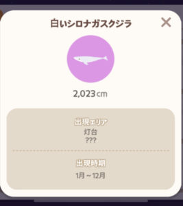 ![]() | 突然変異・白いリーフィーシードラゴン | 深い海/灯台/ビーチリゾート(沖)/ビーチリゾート(難破船)/ビーチリゾート(深海)/ビーチリゾート(マイホーム)の海/サンゴエリア | 一日中 | 中 |