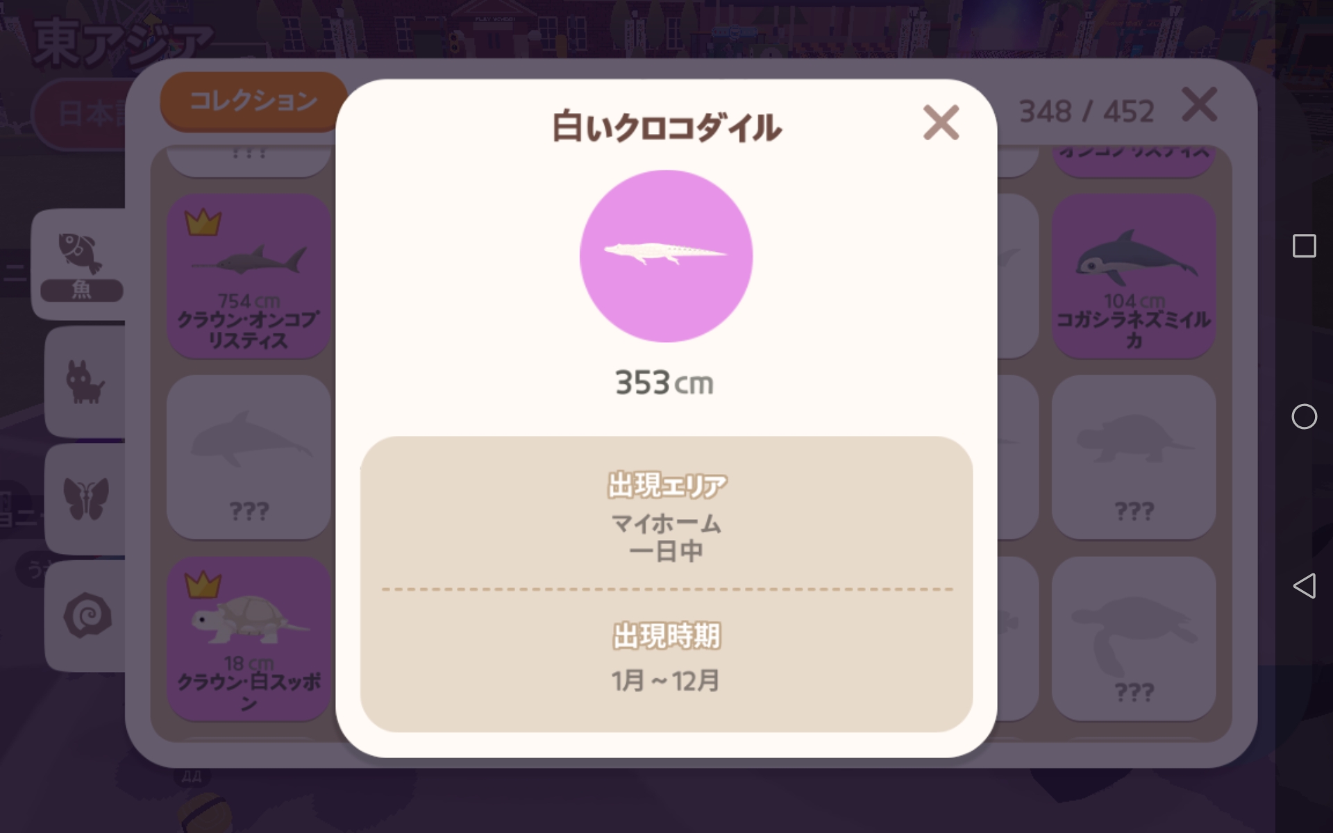 ![]() | ティラピア | 湖/滝/池/プール/マイホーム/ファッションモール/ダウンタウン(すべてのエリア)/ビーチリゾート(池)/ビーチリゾート(プール)/マイホーム(プール) | 一日中 | 中 |