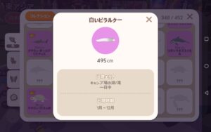 ![]() | オタマジャクシ | 池/ダウンタウンの噴水/ダウンタウンの池/ダイナソーパーク(湖) (出現期間:3月~5月限定) | 一日中 | 小 |