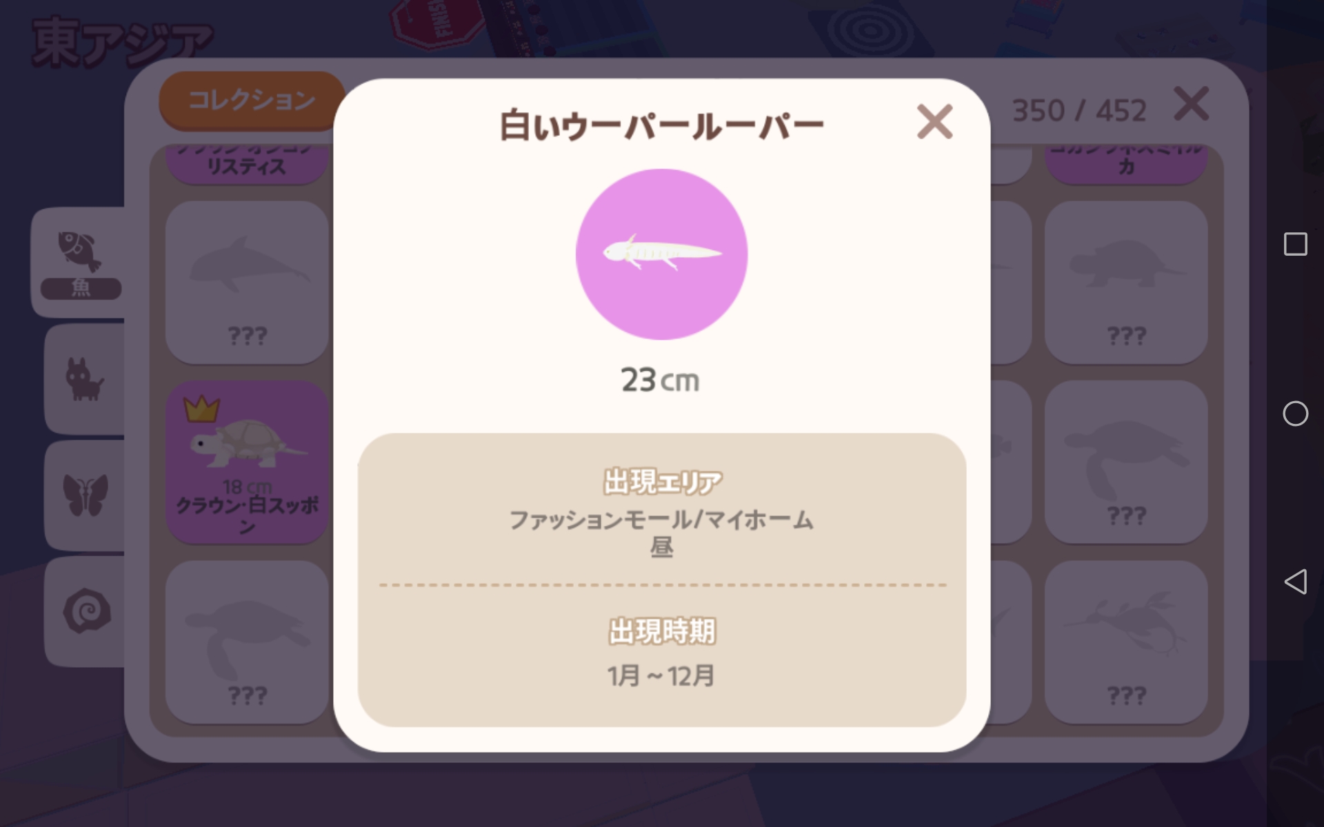 ![]() | アユ | 池/ダイナソーパーク(湖)/滝/プール/ファッションモール/マイホーム/ビーチリゾート(池)/イグルー | 一日中 | 小 |