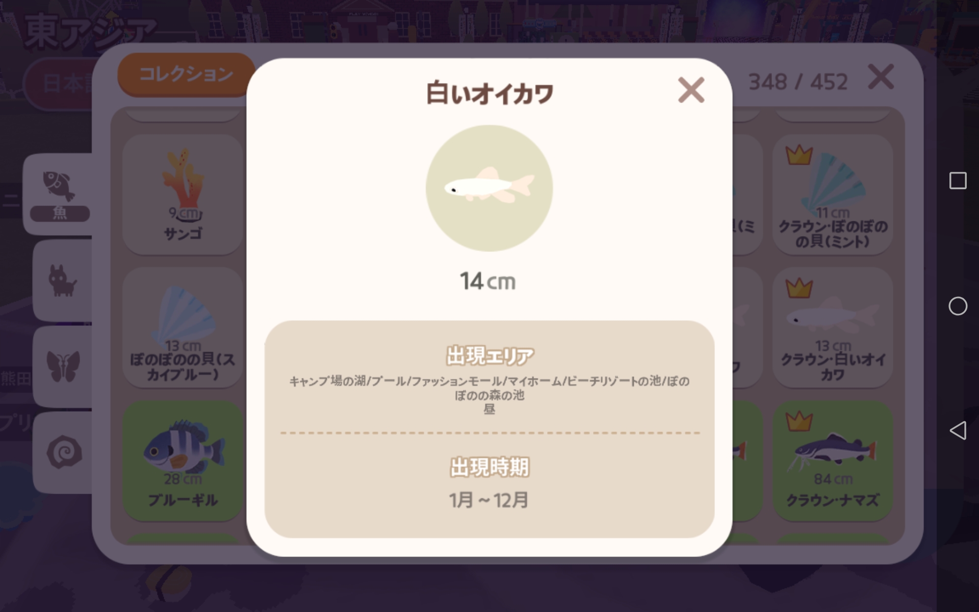 ![]() | メダカ | 池/ダウンタウンの全地域/ビーチリゾート(池)/ビーチリゾート(プール) | 一日中 | 小 |