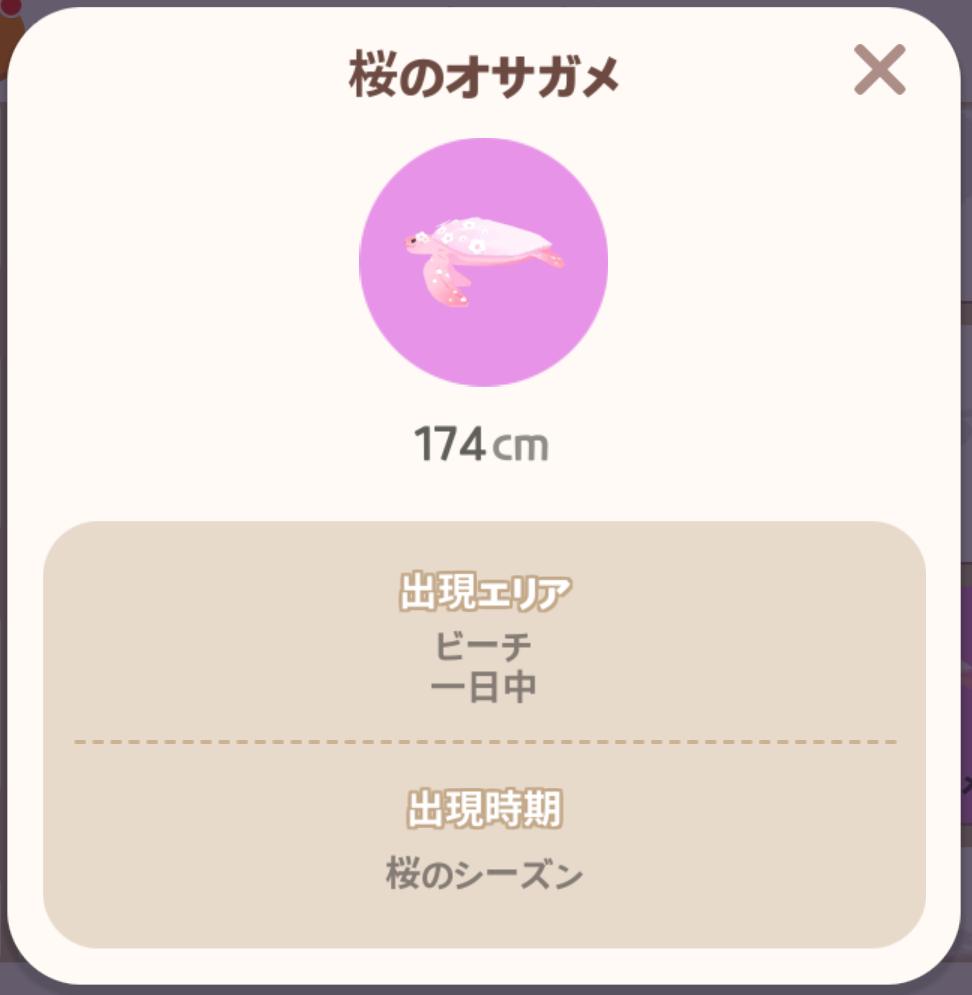 「桜のコイ」、「桜のオサガメ」、「桜のシャチ」を合計3匹捕まえるとクリアです。桜のオサガメはビーチで釣れます。(1日中、魚影:特大)