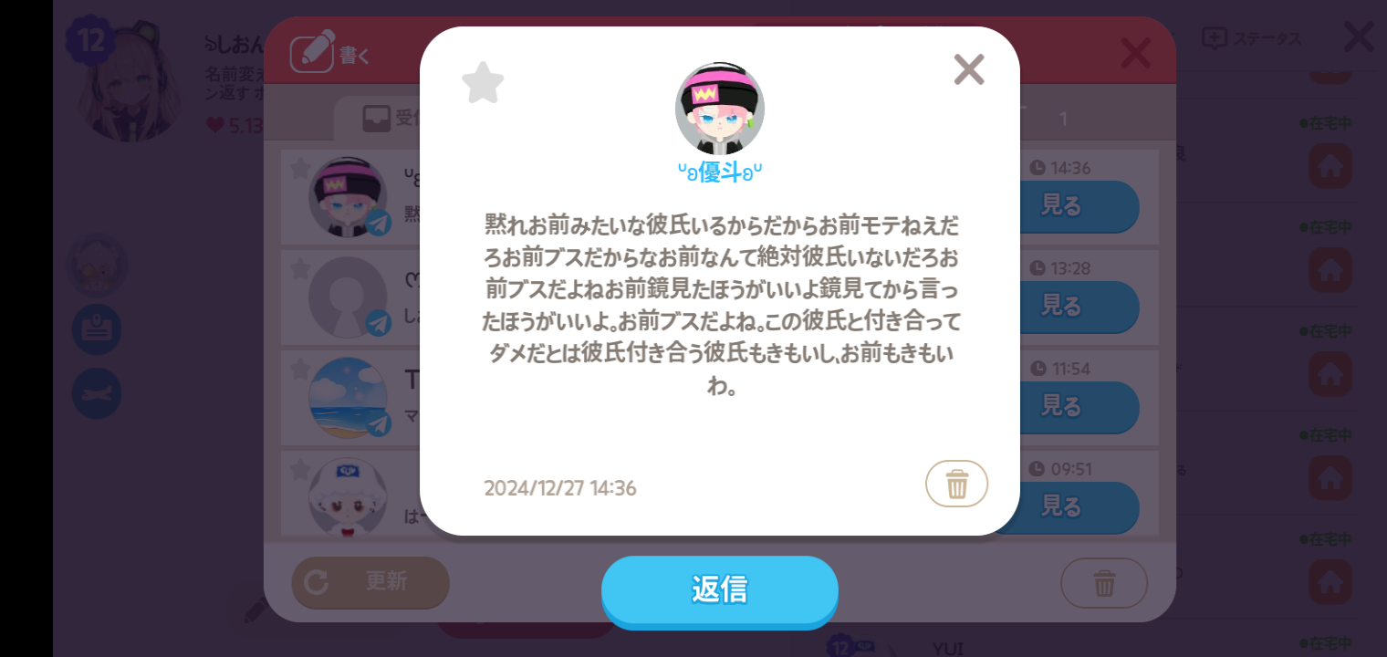フレなってからずっと着いてくる子がいて…その子を切ってブロックしたんです。ブロックする前メールが来てて、返信したら面倒い事になると思って理由を言わずブロックしてたんです。そしたらその子がプロフィール欄に(私の名前)が私のこと嫌いだからこのゲーム辞めるって書いてたんです。(ブロック欄から見て見たら)しかも部屋写真のとこに、良かったら皆んな(私の名前)のゲスブに暴言いってきて荒らして!書いてくれたらファンとハートあげる!って書いててなんか呆れたwその子のゲスブに慰め&そいつ最低!コメが来ててwえ、私こんなに酷いっけ?やっぱり消した理由ちゃんと言えば良かったのかな?って思ったり。ブロックしたら名前も見えなくして欲しいなぁ( ; ; )見たくないからブロックするのに…長文失礼しました。