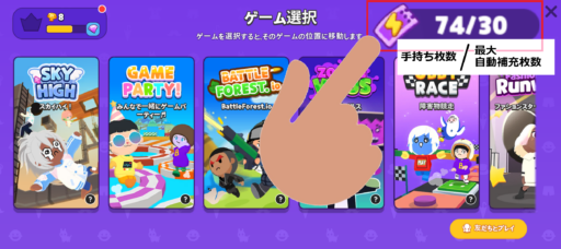 チケット枚数は「ゲーム選択」画面の右上で確認できます。