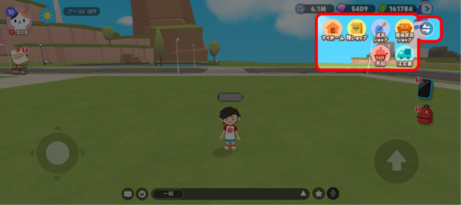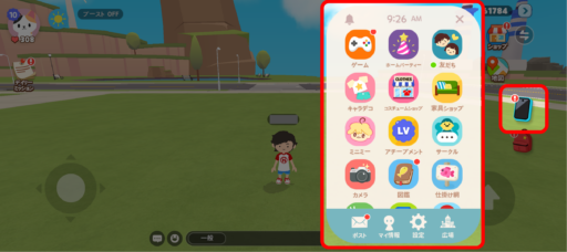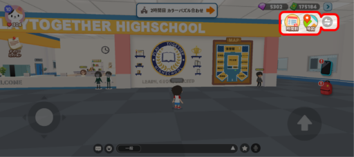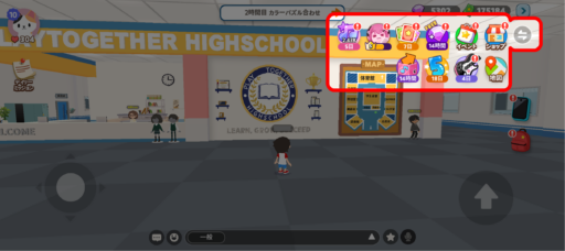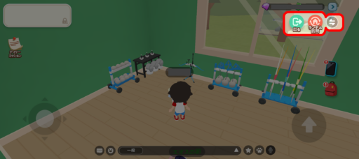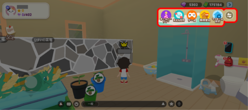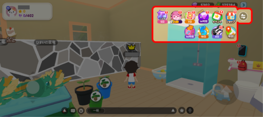 家(自宅と他人宅)、学校内、農場には、専用メニューがあります。「通常メニュー ↔ 専用メニュー」の切り替えは、切り替えアイコン