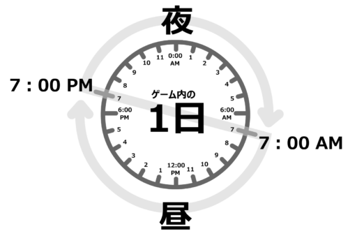 ゲーム内の真夜中は 0分と 30分、真昼間は 15分と45分です。