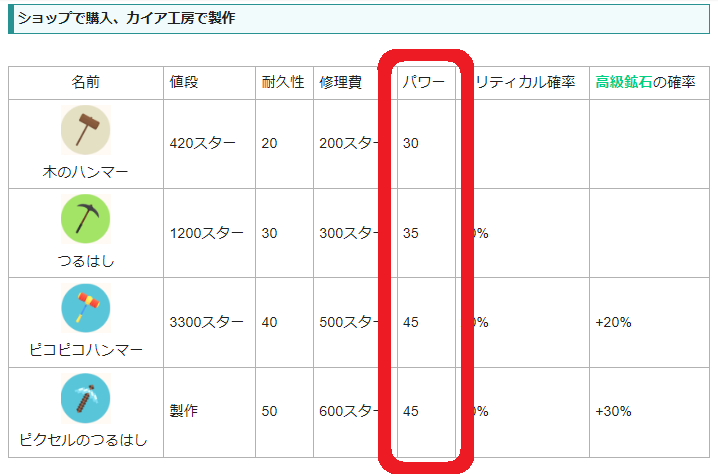 | 名前 | 入手法 | 耐久性 | 修理費 | パワー | クリティカル確率 | 高級鉱石の確率 | 希少鉱石の確率 | 伝説鉱石の確率 |