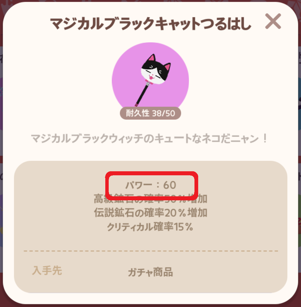 ![]() マジカルブラックキャットつるはし | ガチャ | 50 | 1000スター | 60 | 15% | +50% | +20% |