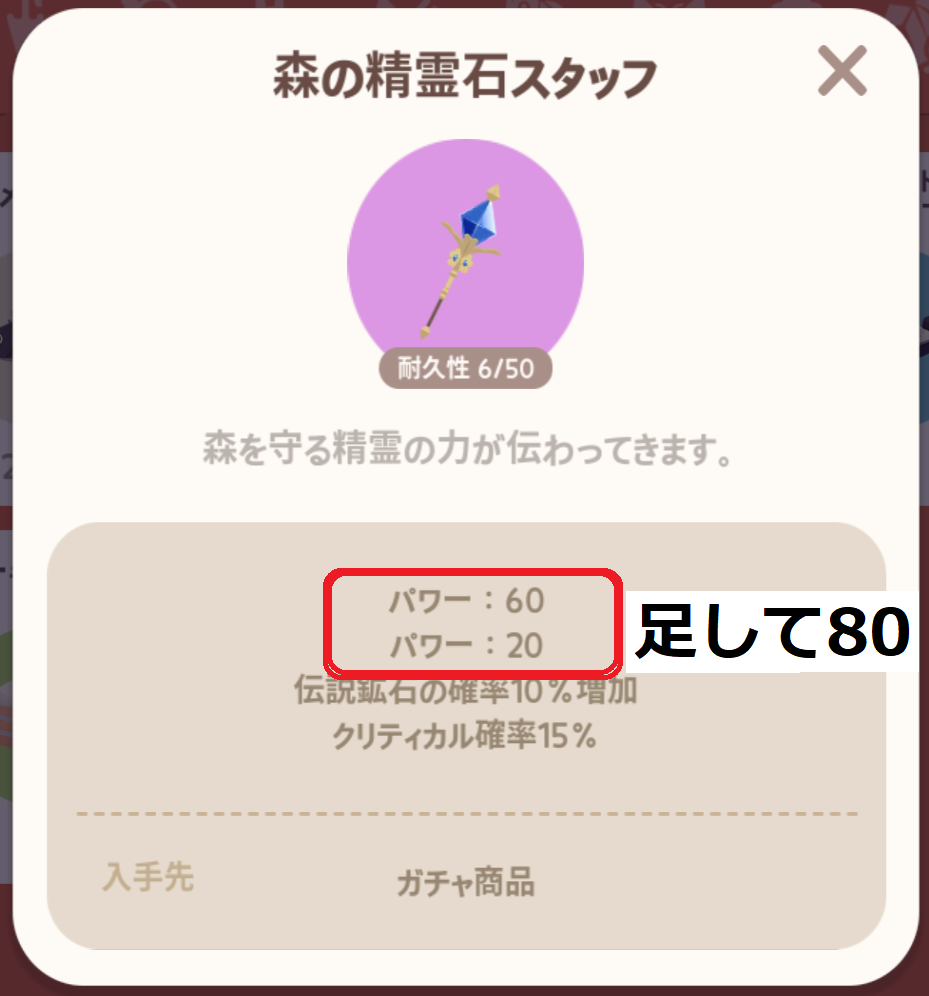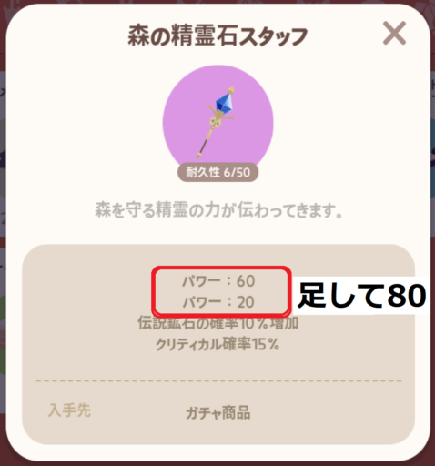 ![]() 森の精霊石スタッフ | ガチャ | 50 | 1000スター | 80 | 15% | +10% | ||