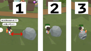 中くらいの石と細長い石を叩いて鉱石や化石を手に入れると、ひび割れが増えていきます。見た目の変化を2度経たら最後は砕けて消えます。