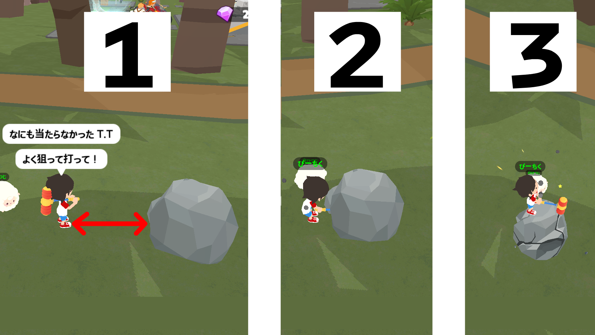 クリティカルが発生すると、思いっきりジャンプして振りかぶる動作になり、石を叩く効果音が大きくなります。
