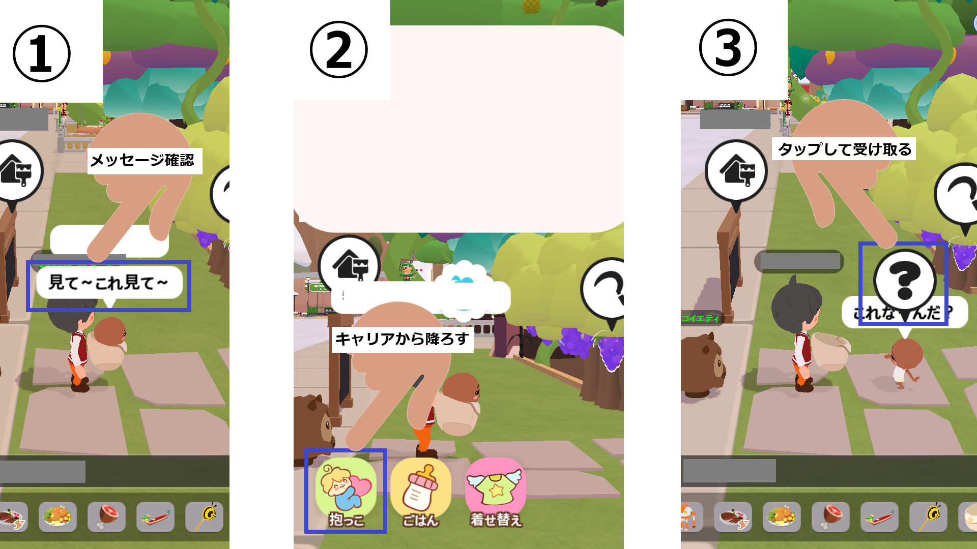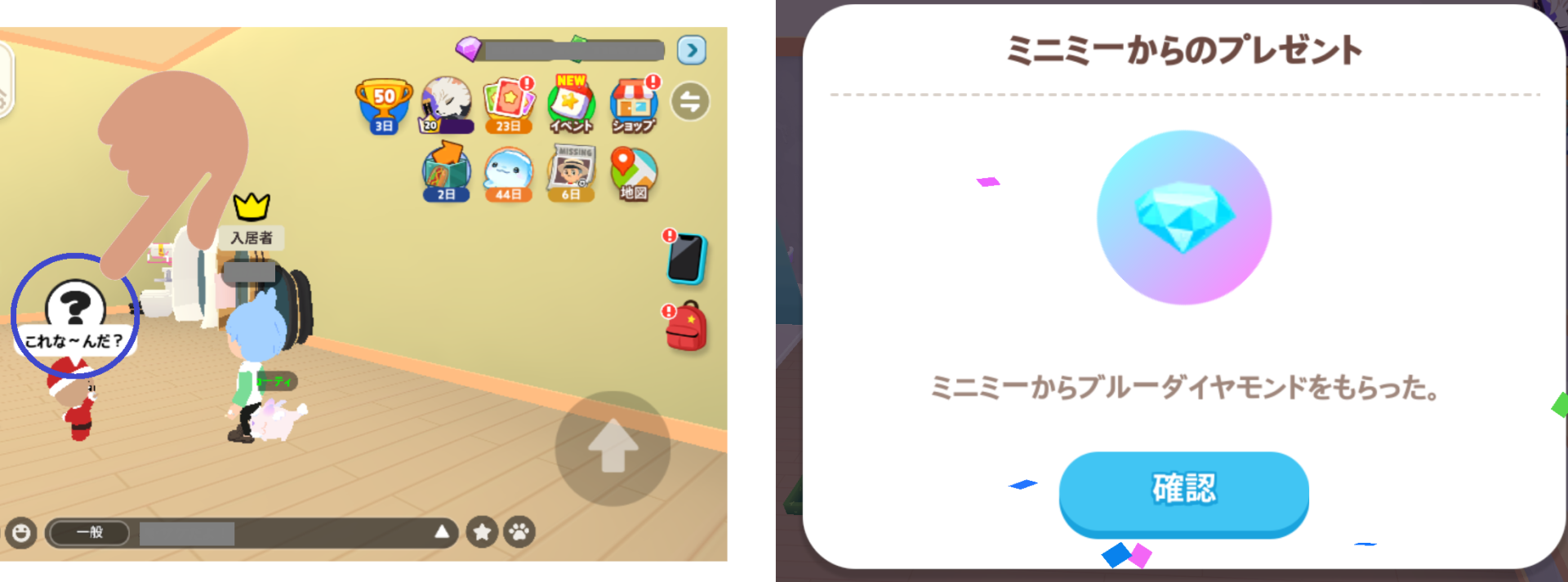ミニミーの頭の上に「?」アイコンが出た時にタップすると、アイテムをもらえます。ミニミーがプレゼントをくれるとき、特徴的なメッセージや声を発します。