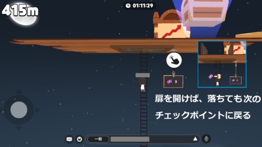 次のチェックポイントまでハシゴを登っていく時、落ちて失敗することがあります。地面が上下に動いたり斜めになっている場所は特に落ちやすいです。
